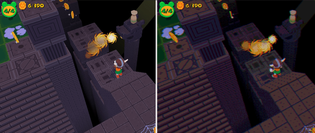 Unfortunately, the grid-based design, limited budget, and decision to set each level in ruins offer level designs that are repetitive and a tad bland at the beginning of the game. However, each level does get more interesting as time goes on. The fact that the levels float in a mostly-featureless skybox is not a big deal when the ruins are darker and scarier in later segments. Bland rock walls and floors are easily spiced up by the inclusion of snow and lava in the last half. Frogun packs its most visually-appealing interesting levels at the end of the game which makes for a great experience where the player becomes more engaged and impressed as they progress.