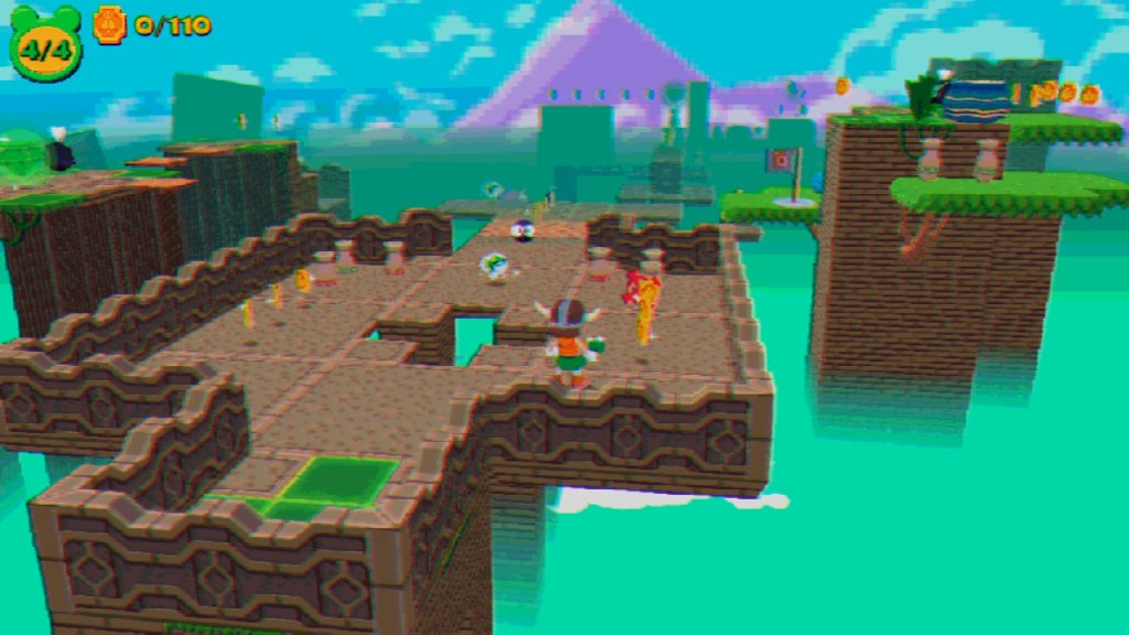 Frogun’s bright colors, expressive character designs, and dedication to low-poly pixelated graphics remind me of Nintendo 64 and Playstation 1 games but don’t feel at all like a carbon copy of any specific style. I can’t say I remember any games from that era using this same grid-based level design or having characters’ faces as images on a flat surface of the head. It may have been easier than giving each character a fully 3D polygonal face, but it does create a unique look that I do enjoy.